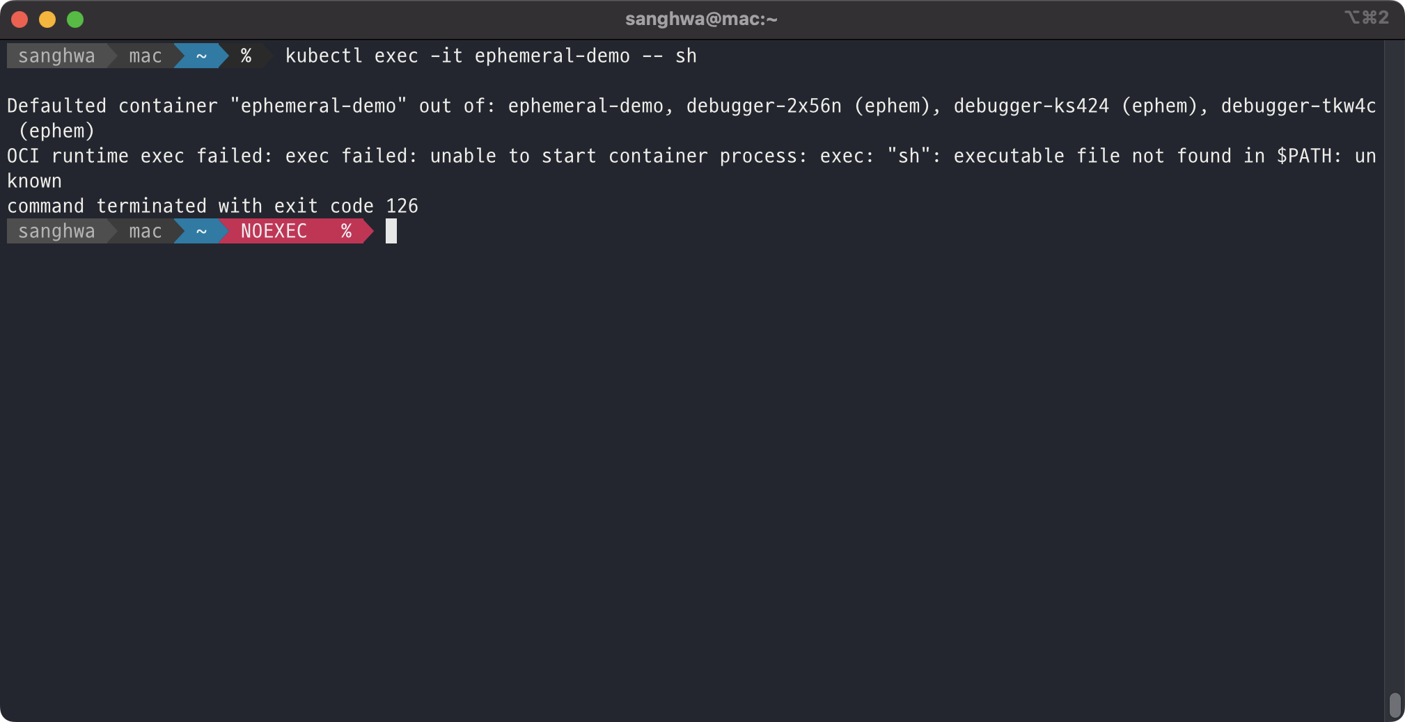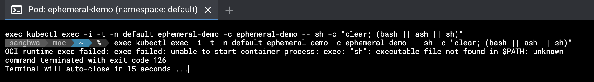 컨테이너가 크래시 됐거나, distroless 이미지처럼 컨테이너 이미지에 디버깅 도구(shell과 yum, apt 같은 패키지 매니저)를 포함하고 있지 않아 kubectl exec로는 충분하지 않은 경우에는 임시(Ephemeral) 컨테이너를 사용하는 것이 인터랙티브한 트러블슈팅에 유용합니다. 즉, shell이 없어서 아래와 같은 오류가 날 때 유용하게 사용할 수 있겠죠.